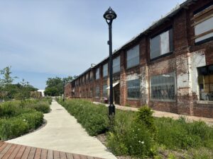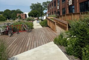 L'une des initiatives les plus remarquables de Bâtiment 7 est la création de la première allée bleue et verte du Canada. la première allée bleu-vert du Canada. Ce projet novateur - une passerelle en bois bordée d'un éventail de plantes - transforme une allée urbaine typique en un espace communautaire agréable qui favorise la gestion des eaux pluviales. Lors de la visite de notre équipe en juin, la Blue-Green Alley était en pleine floraison, avec une verdure luxuriante flanquant le bâtiment 7. Entourée par le paysage urbain de Pointe-St-Charles, la ruelle paisible semblait être une échappatoire rafraîchissante pour les résidents.