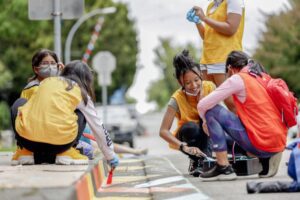 STUDENTS PAINT CURB BUMP-OUTS IN NEW WESTMINSTER, BOOSTING A SENSE OF BELONGING—AND TRAFFIC SAFETY. PHOTO BY JARED KORB.