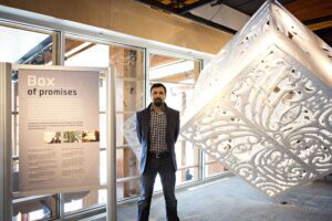 L'artiste haïda de Squamish, Cory Douglas, à côté d'une œuvre créée en collaboration avec l'artiste maori George Nuku. Photo de l'artiste : Cory Douglas