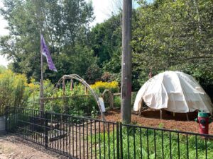 Le Heart Berry Lodge d'Evergreen Brick Works accueille des cérémonies et des feux sacrés. À gauche, le jardin Gitigaan, où le personnel d'Evergreen travaille avec la communauté pour cultiver des plantes et des légumes indigènes, en suivant les pratiques traditionnelles de souveraineté alimentaire et d'intendance des autochtones. Photo : EvergreeN.