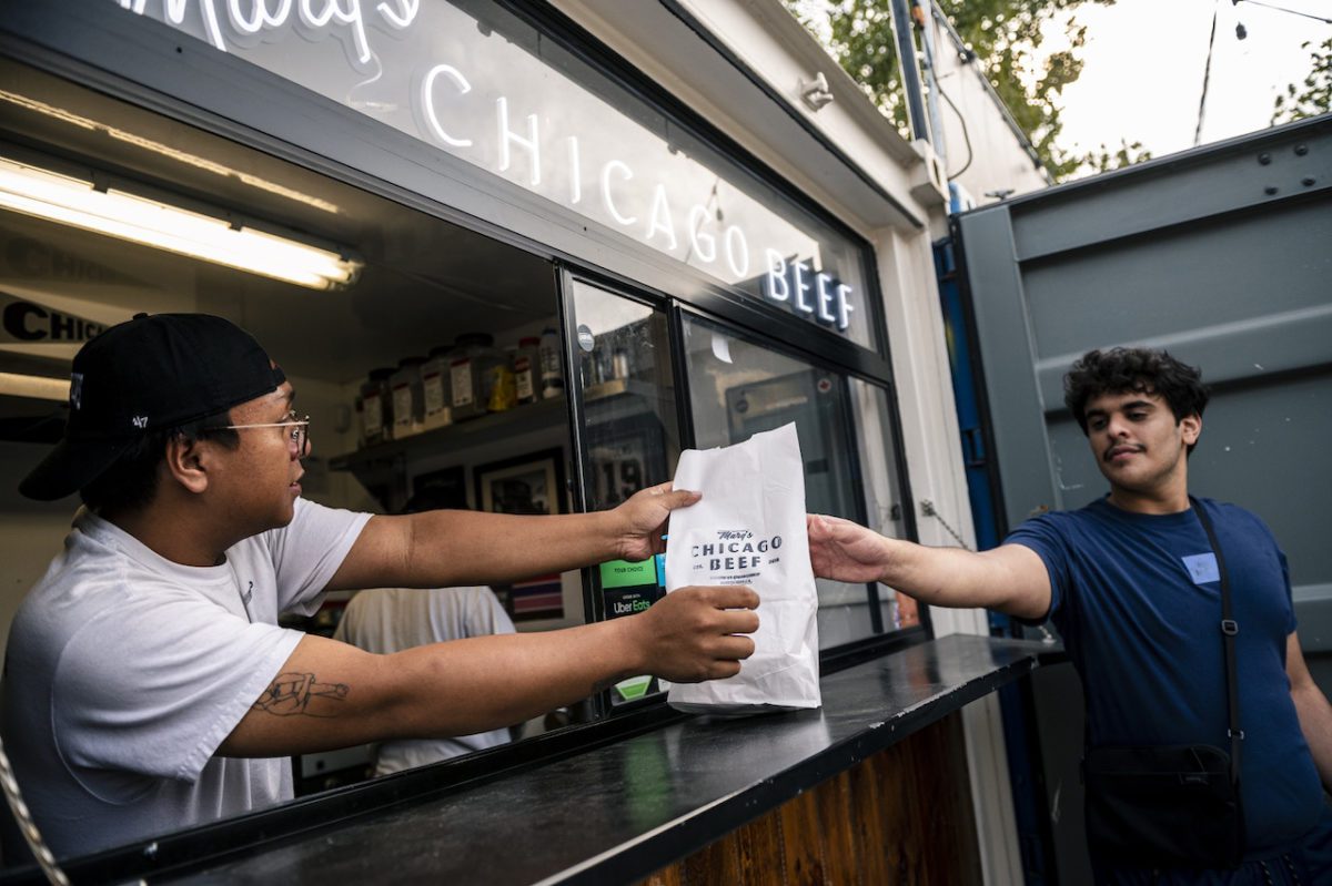 Ryan Lim sert un client dans son restaurant Marq's Chicago Beef. Photo : The Local StoryLab