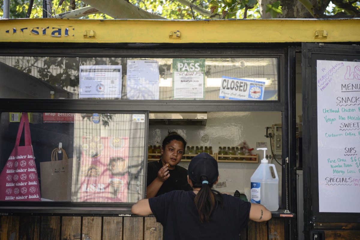 Akash Swar, copropriétaire de Little Sister Bakery, s'entretient avec Su Jin Won, voisine du marché 707, de Sulee Dosirak. Photo : The Local StoryLab