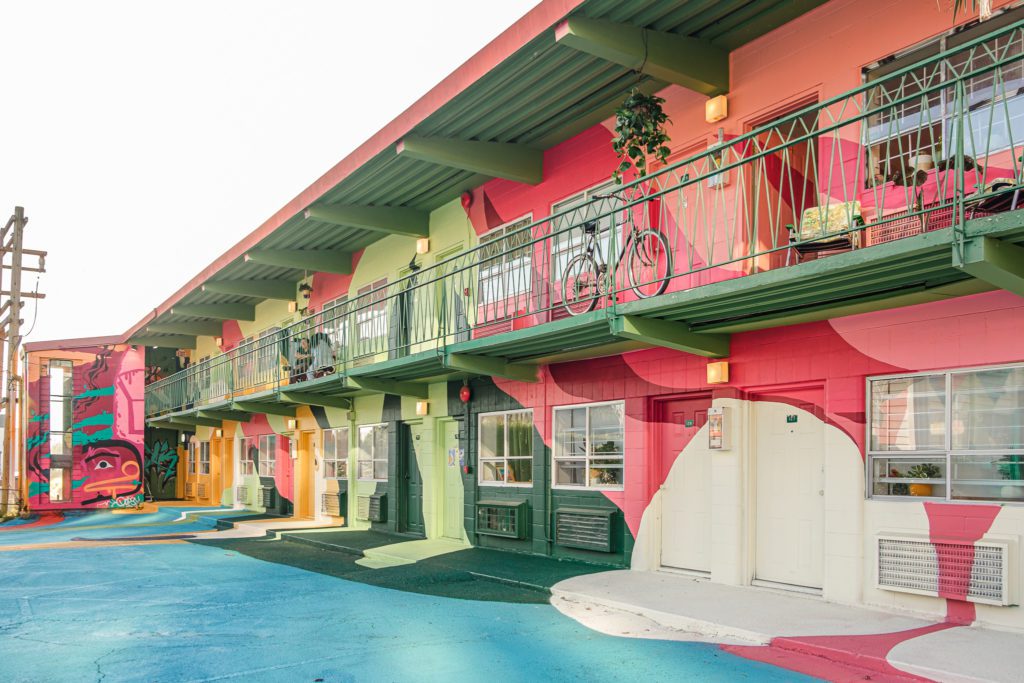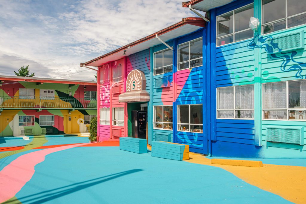 Première étape de ce projet temporaire pluriannuel, les 75 chambres de l'ancien motel ont été converties en studios d'artistes à bas prix par The Narrow Group. Ensuite, nous avons pris le relais pour transformer complètement l'extérieur (toute la façade du bâtiment et le parking) avec notre plus grande fresque murale à ce jour, couvrant plus de 30 000 pieds carrés et créant un environnement immersif pour l'art et la connexion sociale. Conçue en collaboration par trois artistes locaux - Fiona Ackerman, KC Hall et Joon Lee - la fresque murale combine les styles des artistes tout en s'inspirant des éléments originaux du motel emblématique.
