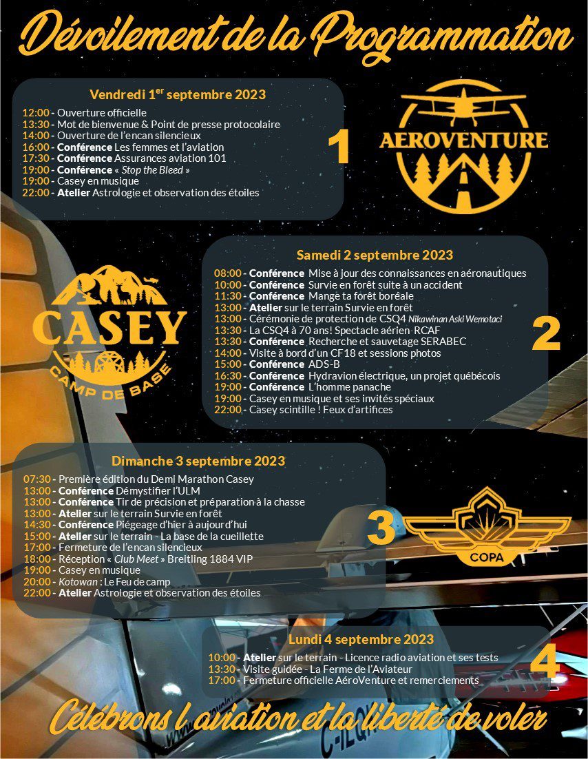 CASEY, QC - AéroVenture, présenté par le Camp de Base et Club Copa 217 a le plaisir de vous dévoiler sa programmation en vue de la 3e édition de l'événement, qui aura lieu du 1er au 4 septembre prochain sur le territoire des vestiges militaires et la piste d'atterrissage CSQ4 dans le secteur de Casey, à La Tuque.