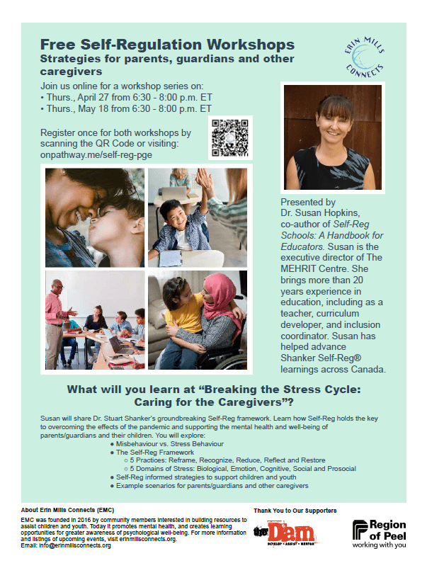 Rejoignez Erin Mills Connects en ligne pour une série d'ateliers GRATUITS sur l'autorégulation présentés par le Centre MEHRIT, les personnes qui ont littéralement écrit les livres sur l'autorégulation à l'école : A Handbook for Educators et Self-Reg. La série aura lieu le jeudi 27 avril de 18 h 30 à 20 h 00 (heure de l'Est) et le jeudi 18 mai de 18 h 30 à 20 h 00 (heure de l'Est). Inscrivez-vous une fois pour les deux ateliers en visitant : onpathway.me/self-reg-pge.