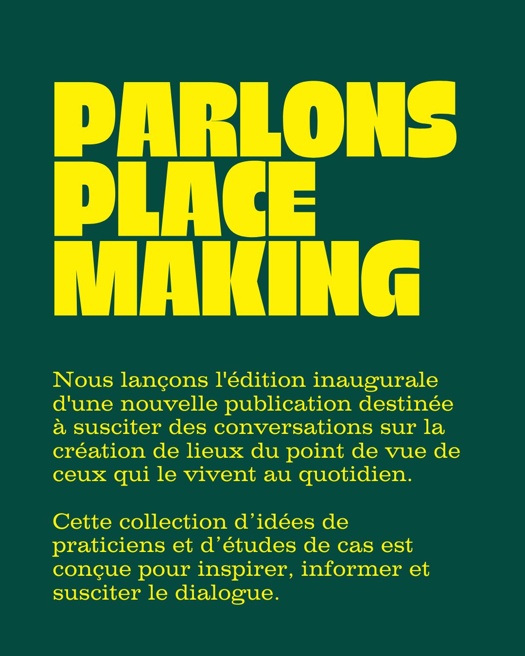 Parlons Placemaking a été créé comme une ressource pour informer, inspirer et ouvrir de nouvelles conversations sur la planification des espaces publics. À travers des études de cas sur des projets, des innovations en matière de politiques et des analyses stratégiques d'experts, cette publication souligne le potentiel de l'aménagement des espaces publics pour favoriser des communautés dynamiques et résilientes.